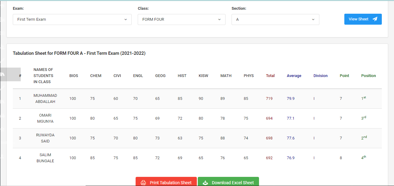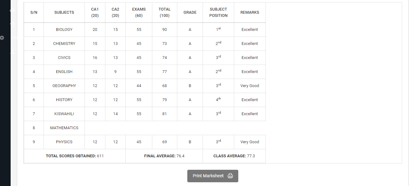 including exam listing, grades management, mark recording, result generation, mark sheets, and result printing, results, showing class student performance position.