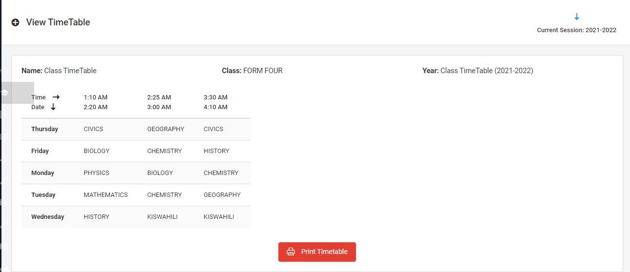 Creating Exam and Class Timetable: Streamline exam and Class scheduling and allocation. Printing Timetable: Generate and distribute timetables seamlessly.